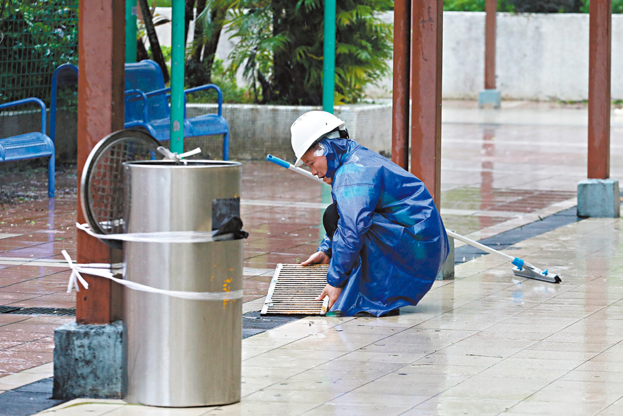 ●清潔工人在超強颱風吹襲下清理渠蓋。 香港文匯報記者黃艾力 攝