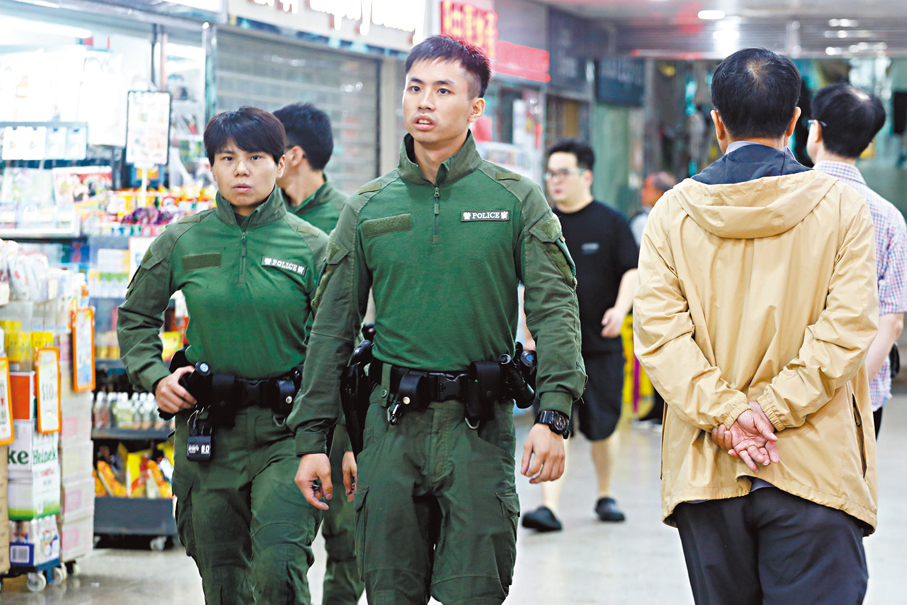 ●警員在超強颱風吹襲下巡邏。 香港文匯報記者黃艾力 攝