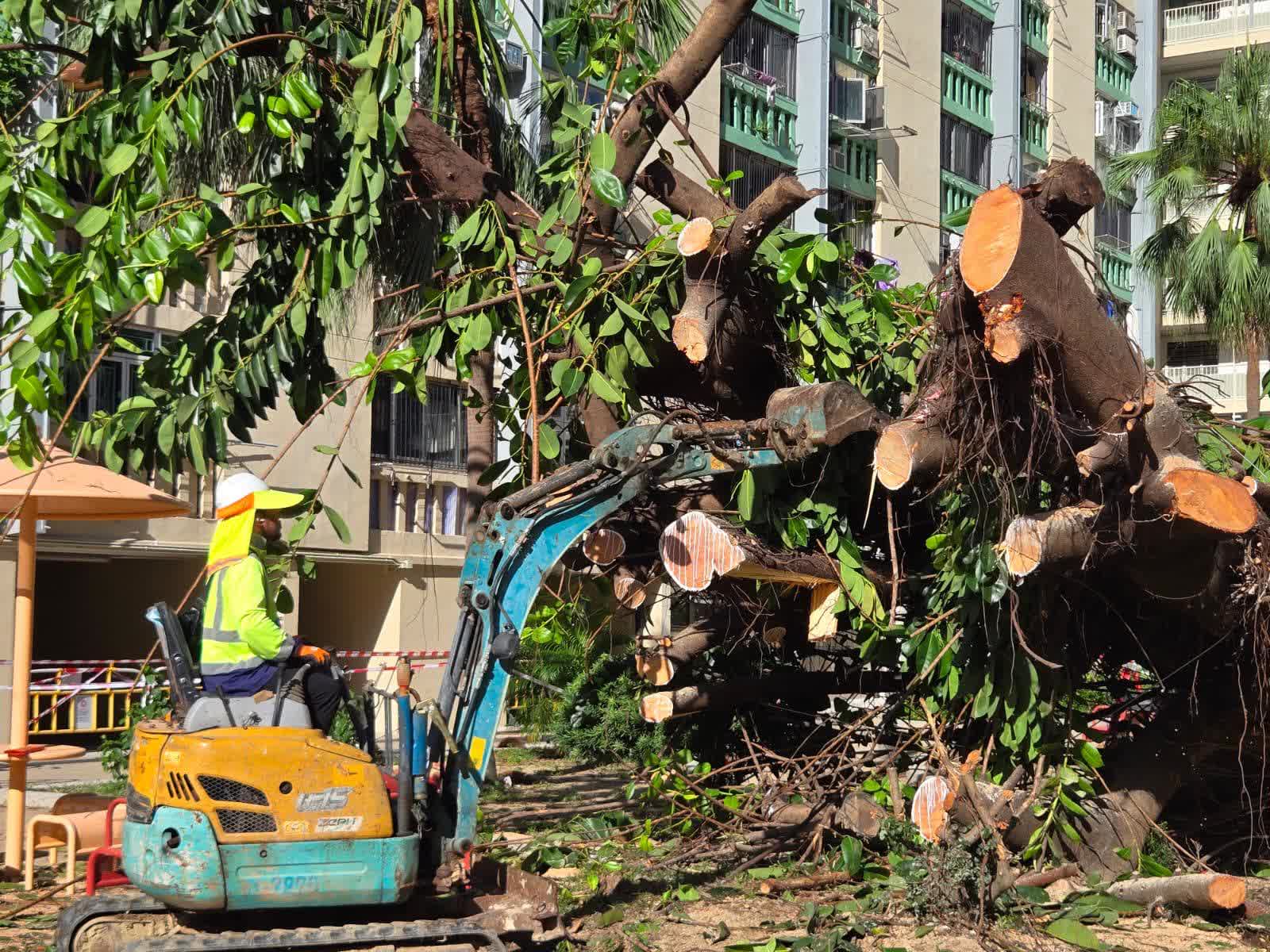 房屋署在其社交平臺表示,職員十分明白該棵橡樹陪伴愛民邨成長,對居民有著一份深厚感情而別具意義,因此連日來除了積極清理善後外,更加盡最大努力,構(gòu)思一切可行方案,嘗試全力挽救該棵橡樹的生命。房委會昨日(27日)在其社交專頁表示,房署昨日已經(jīng)完成愛民邨的緊急清理工作,還在平衡安全及保育的前提下,盡量減細(xì)樹身,利用物理原理,運用樹的重量令樹身自然回復(fù)原位。