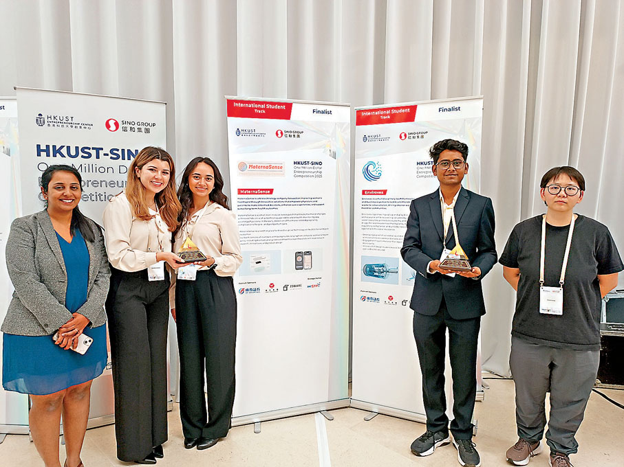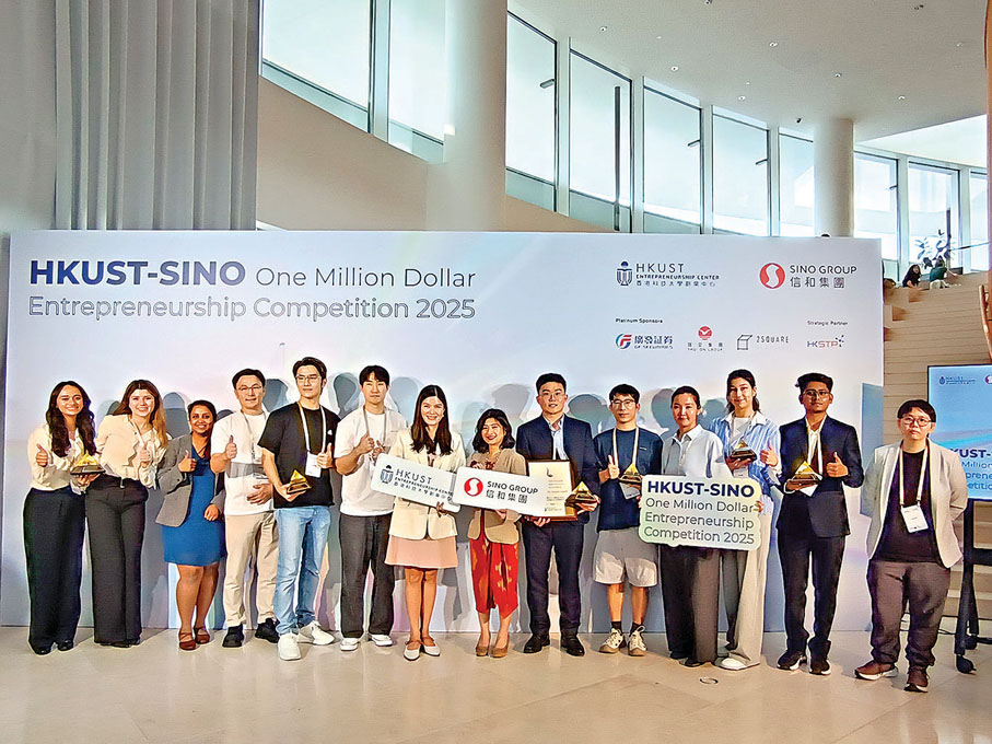 特區政府大力推動「政產學研投」協同創新,促進香港創科生態蓬勃發展。香港科技大學與信和集團聯合主辦的「科大—信和百萬獎金創業大賽 2025」香港區決賽及頒獎禮昨日在科大校園舉行。有本港創業隊伍積極投入太空經濟,透過開發「飛廉星座計劃」,依託高光譜衛星所得自家專利數據,推動高解析度天氣與氣候智能的發展,並以「氣候即服務(Climate-as-a-Service)」的模式,支援多個行業領域落實氣候韌性方案,同時獲白金獎以及可持續發展影響力獎。●香港文匯報記者 陸雅楠