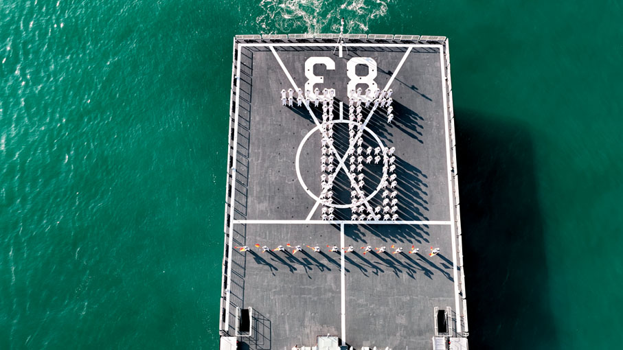 在戚繼光艦後甲板上,100餘名官兵擺出「76」字樣,並用旗語展示出「國安家好」的含義,為中華人民共和國成立76周年和香港市民送上祝福。不少香港市民自發在岸邊向艦上分區列隊的學員和官兵揮手致意。其後,戚繼光艦放下舷梯,編隊領導及官兵、學員代表在熱烈的軍樂聲中踏上昂船洲軍營碼頭,與駐港部隊官兵代表互致問候。