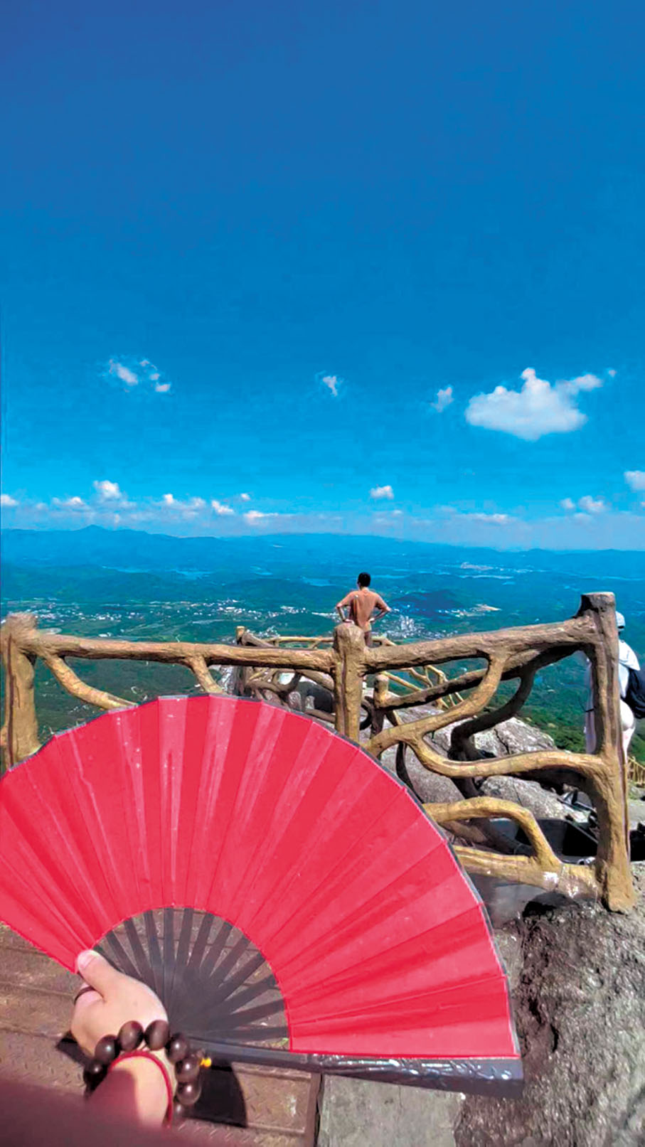「哇,大佬,仲有幾耐到頂啊?」好漢坡上,香港大叔扶著膝蓋喘氣,額頭上的汗順著皺紋往下淌。千多級石階爬得我嗓子眼冒火,腿肚子發顫,卻被轉角處的鷹嘴巖驚得忘了累, 這塊巨石真像展翅的老鷹要撲向山澗,翅膀上還站著幾個阿姨在拍照,風把她們的絲巾吹得像團跳動的火,給冷峻的山石添了抹亮色。