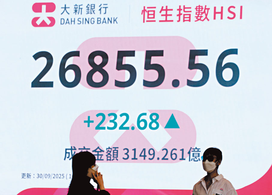 香港文匯報訊(記者 岑健樂)年初至今港股持續表現亮麗,恒指單計第三季已上升2,783點或11.56%,連升三季,首三季共升6,795點或34%。展望第四季,市場預期今年美聯儲或會再減息兩次,令中國人民銀行有更大空間放寬內地貨幣政策的空間,加上憧憬內地「十五五」規劃將有更多支持經濟增長的措施出臺,為港股帶來更多支持,有市場人士認為第四季港股有望再次挑戰年內高位,即27,000點水平。