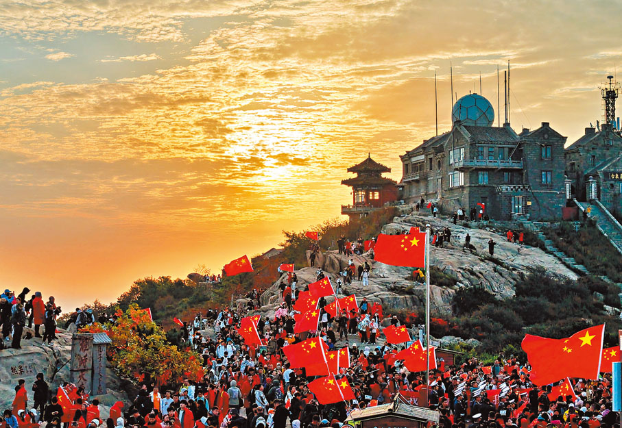 【泰山之巔】10月1日,萬名遊客齊聚泰山之巔,以升國旗、觀日出、唱愛國歌曲的方式,慶祝中華人民共和國成立76周年。 中新社