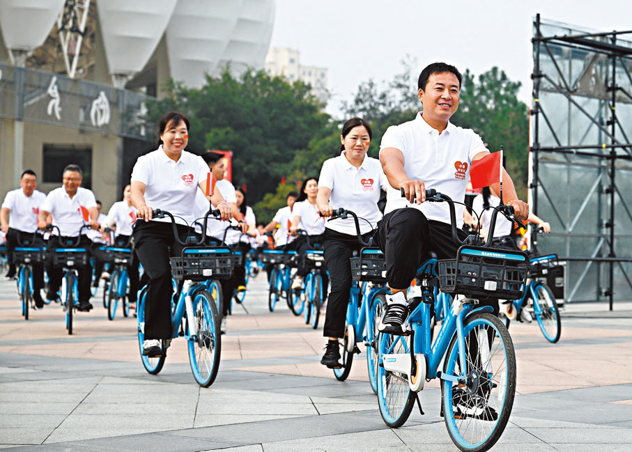 【江蘇】10月1日,江蘇省淮安市盱眙縣舉行「共賀祖國華誕」綠色騎行活動,參與者騎車出發。 新華社