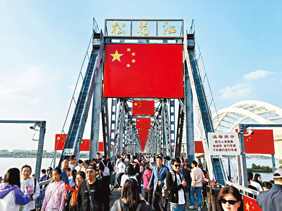 【哈爾濱】國慶假期首日,有120餘年歷史的黑龍江哈爾濱中東鐵路大橋懸掛起百餘面五星紅旗,吸引全國各地遊客。 香港文匯報記者于海江 攝