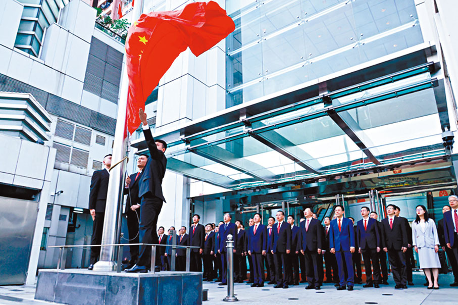 上午7時,升國旗儀式開始。中央政府駐港聯絡辦主任周霽,副主任劉光源、羅永綱、尹宗華、祁斌和秘書長王松苗,以及幹部員工代表在辦公樓前莊嚴肅立。升旗手邁著堅定有力的步伐,護衛五星紅旗走向升旗臺。在激昂的國歌聲中,升旗手展臂一揮,鮮艷的五星紅旗冉冉升起,迎風飄揚。全體人員向國旗行注目禮,齊聲高唱國歌,表達對祖國繁榮昌盛、中華民族偉大復興的美好祝願。