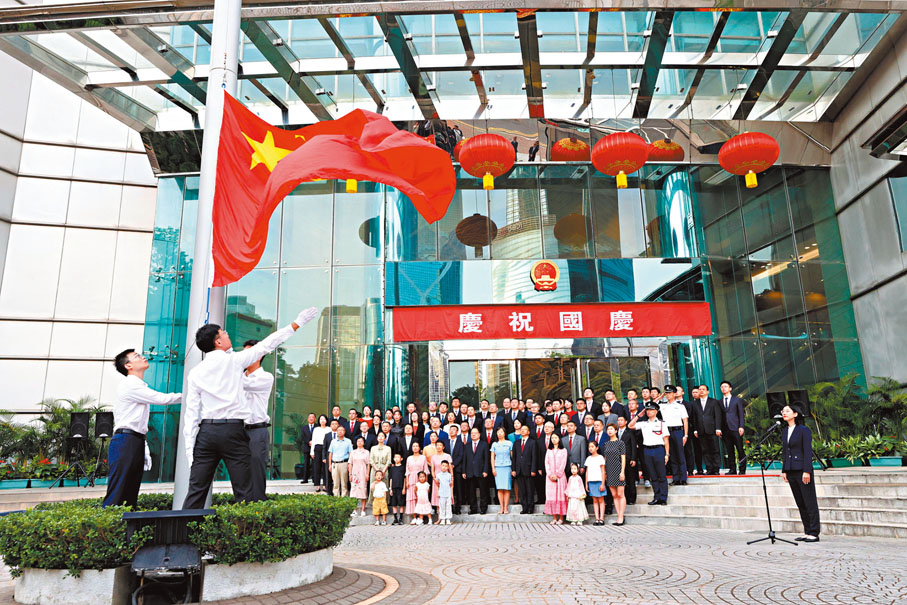 據中央政府駐港聯絡辦網訊,10月1日,中央人民政府駐香港特別行政區聯絡辦公室舉行升國旗儀式,慶祝中華人民共和國成立76周年。