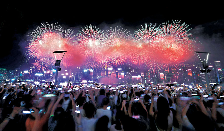 迷人的維多利亞港夜空化作獨一無二的背景天幕,映襯著逾三萬枚煙花彈拼湊出來的朵朵牡丹、金菊、家喻戶曉的哪吒及六隻大熊貓等煙花圖案,在維港兩岸34.4萬名觀眾震耳欲聾的尖叫聲與歡呼聲中,一一綻放光芒,夾岸人們紛紛高舉手機及專業攝影器材,拍下煙花璀璨的精彩瞬間。今年香港國慶煙花匯演是格外閃耀奪目,寓意國家繼續昌盛繁榮,令每一位中華兒女都感到振奮、自豪、驕傲,也體現香港與內地同胞同心慶祝祖國生日的濃厚情誼。 ●香港文匯報記者 張茗
