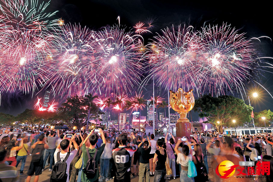 煙花匯演昨晚8時在維港舉行,警方估計,全程吸引超過34.4萬人在維港兩岸觀看,比預期多5萬人。今年主題為「維港煙花,閃耀中華」,分八幕共歷時23分鐘,發放逾3萬枚煙花。除祝賀國慶外,匯演亦分別以東江水、哪吒、大熊貓、航天夢、全運會等作主題,寓意深長。