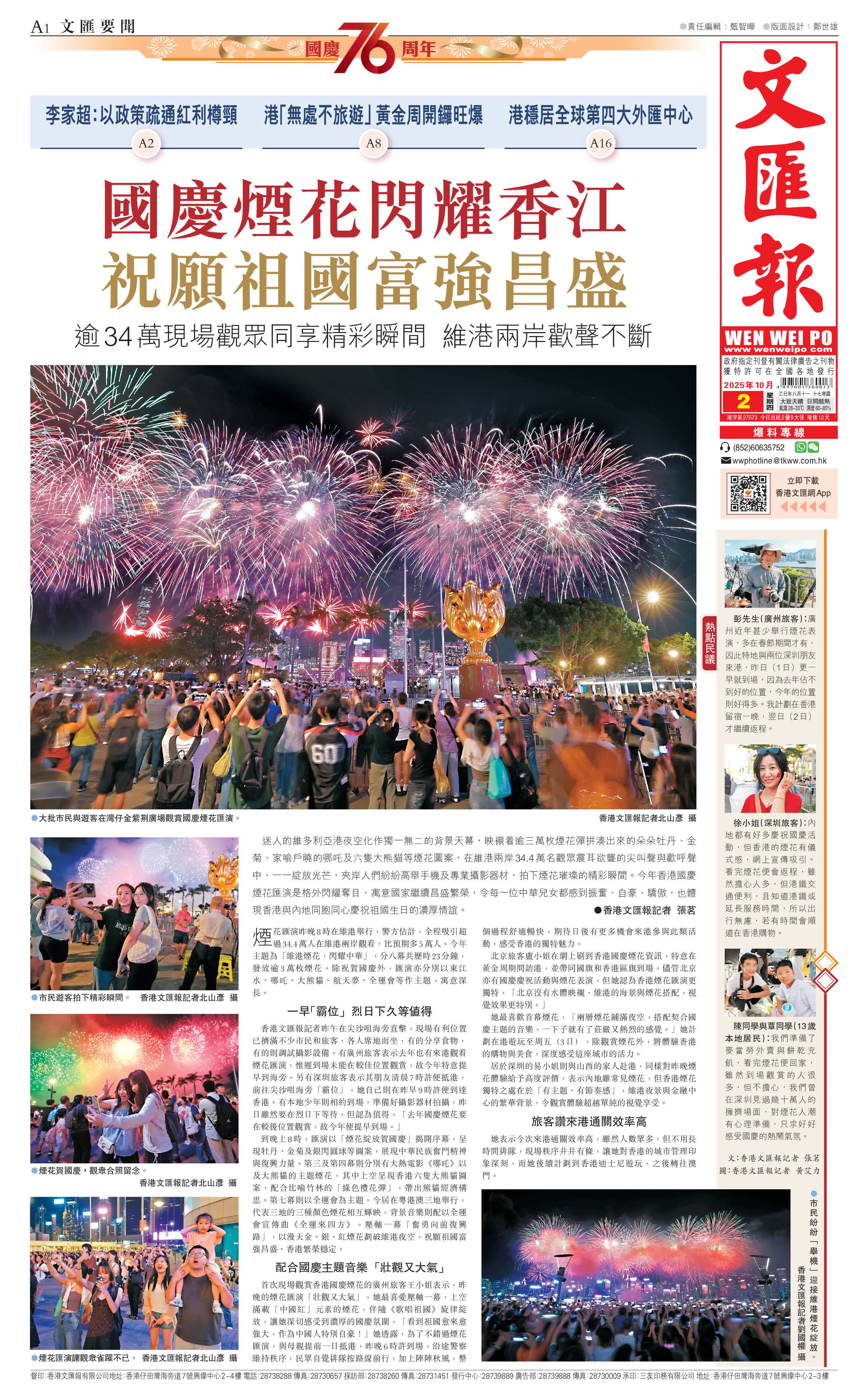 首次現場觀賞香港國慶煙花的廣州旅客王小姐表示,昨晚的煙花匯演「壯觀又大氣」,她最喜愛壓軸一幕,上空滿載「中國紅」元素的煙花,伴隨《歌唱祖國》旋律綻放,讓她深切感受到濃厚的國慶氛圍,「看到祖國愈來愈強大,作為中國人特別自豪!」她透露,為了不錯過煙花匯演,與母親提前一日抵港,昨晚6時許到場,沿途警察維持秩序,民眾自覺排隊按路線前行,加上陣陣秋風,整個過程舒適暢快,期待日後有更多機會來港參與此類活動,感受香港的獨特魅力。
