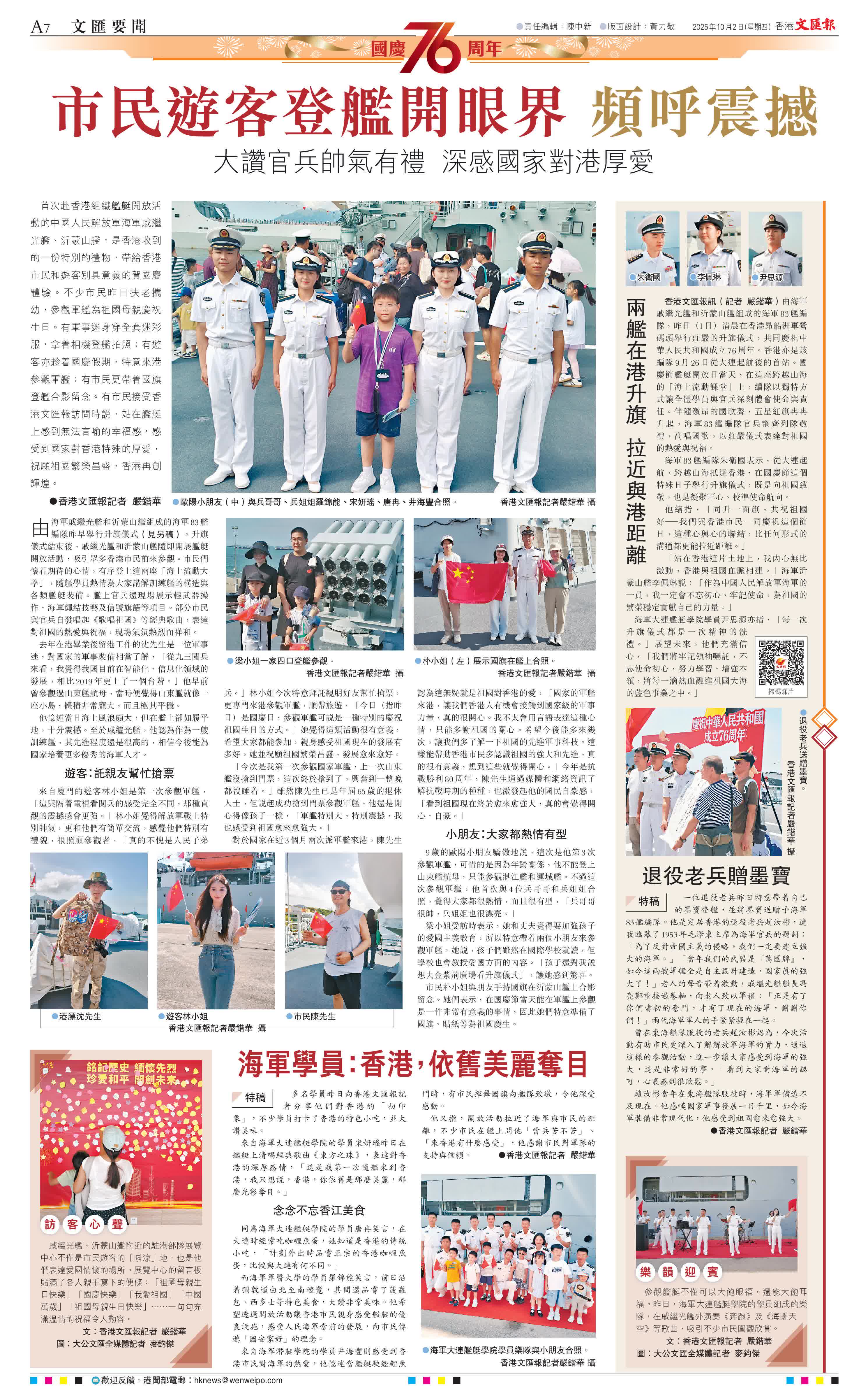 由海軍戚繼光艦和沂蒙山艦組成的海軍83艦編隊昨早舉行升旗儀式。升旗儀式結束後,戚繼光艦和沂蒙山艦隨即開展艦艇開放活動,吸引眾多香港市民前來參觀。市民們懷著期待的心情,有序登上這兩座「海上流動大學」,隨艦學員熱情為大家講解訓練艦的構造與各類艦艇裝備。艦上官兵還現場展示輕武器操作、海軍繩結技藝及信號旗語等項目。部分市民與官兵自發唱起《歌唱祖國》等經典歌曲,表達對祖國的熱愛與祝福,現場氣氛熱烈而祥和。