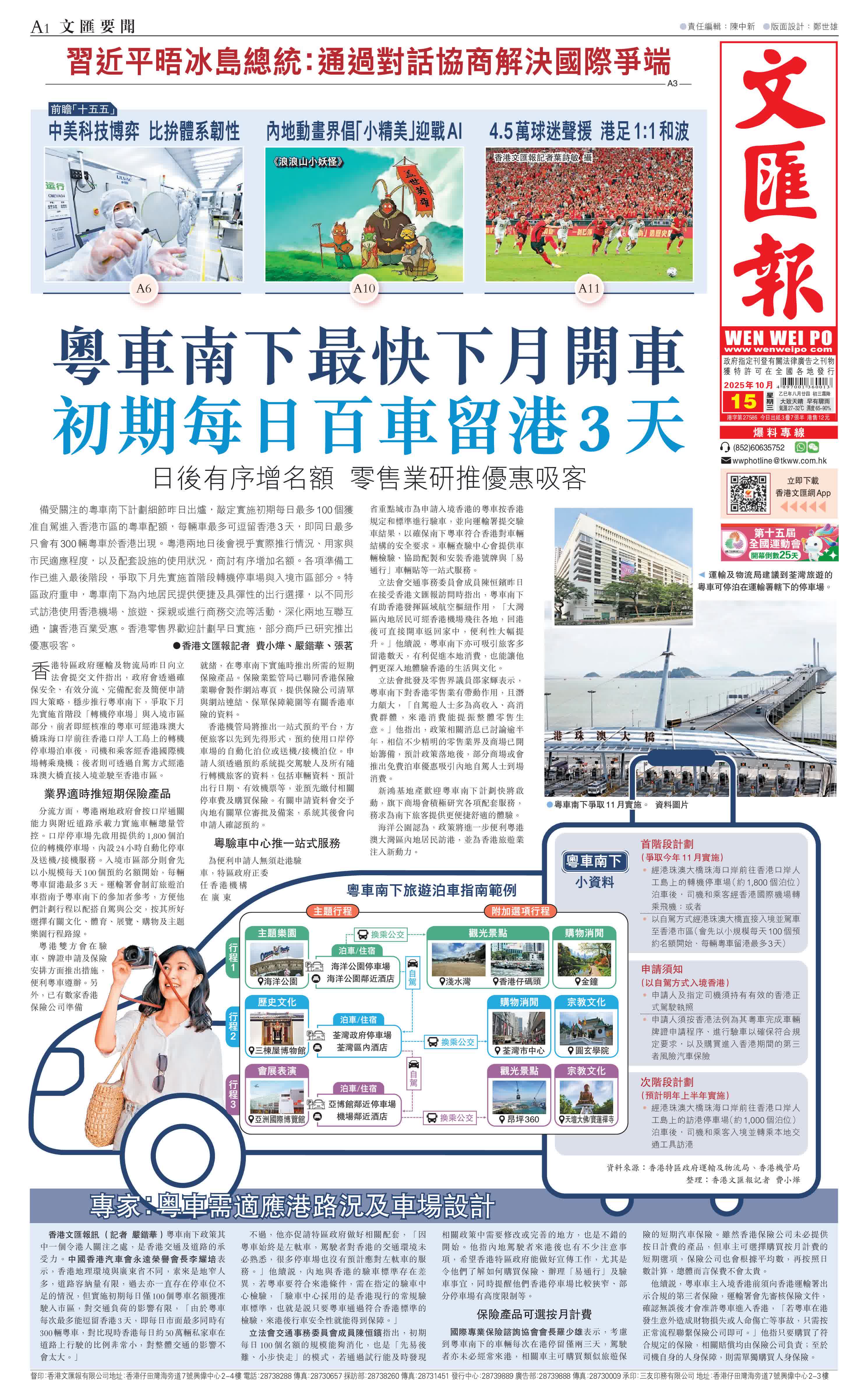 (香港文匯報記者 費小燁、嚴(yán)鍇華、張茗)備受關(guān)注的粵車南下計劃細節(jié)昨日出爐,敲定實施初期每日最多100個獲準(zhǔn)自駕進入香港市區(qū)的粵車配額,每輛車最多可逗留香港3天,即同日最多只會有300輛粵車於香港出現(xiàn)。粵港兩地日後會視乎實際推行情況、用家與市民適應(yīng)程度,以及配套設(shè)施的使用狀況,商討有序增加名額。各項準(zhǔn)備工作已進入最後階段,爭取下月先實施首階段轉(zhuǎn)機停車場與入境市區(qū)部分。特區(qū)政府重申,粵車南下為內(nèi)地居民提供便捷及具彈性的出行選擇,以不同形式訪港使用香港機場、旅遊、探親或進行商務(wù)交流等活動,深化兩地互聯(lián)互通,讓香港百業(yè)受惠。香港零售界歡迎計劃早日實施,部分商戶已研究推出優(yōu)惠吸客。